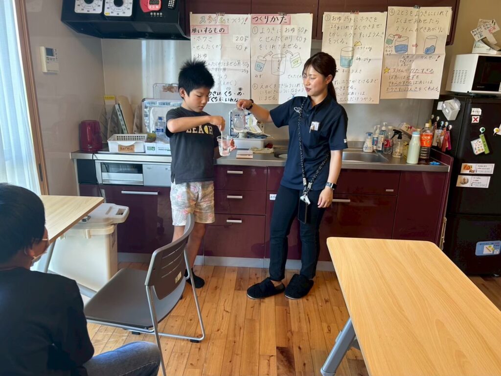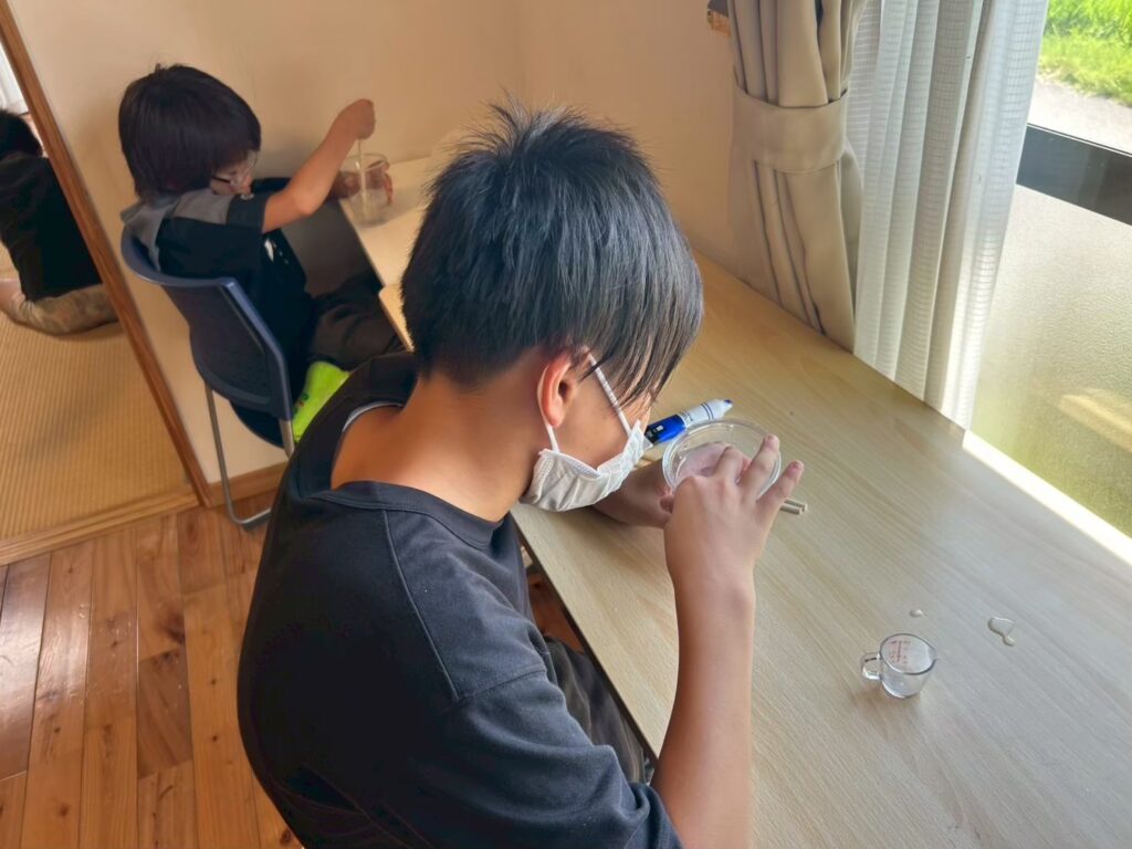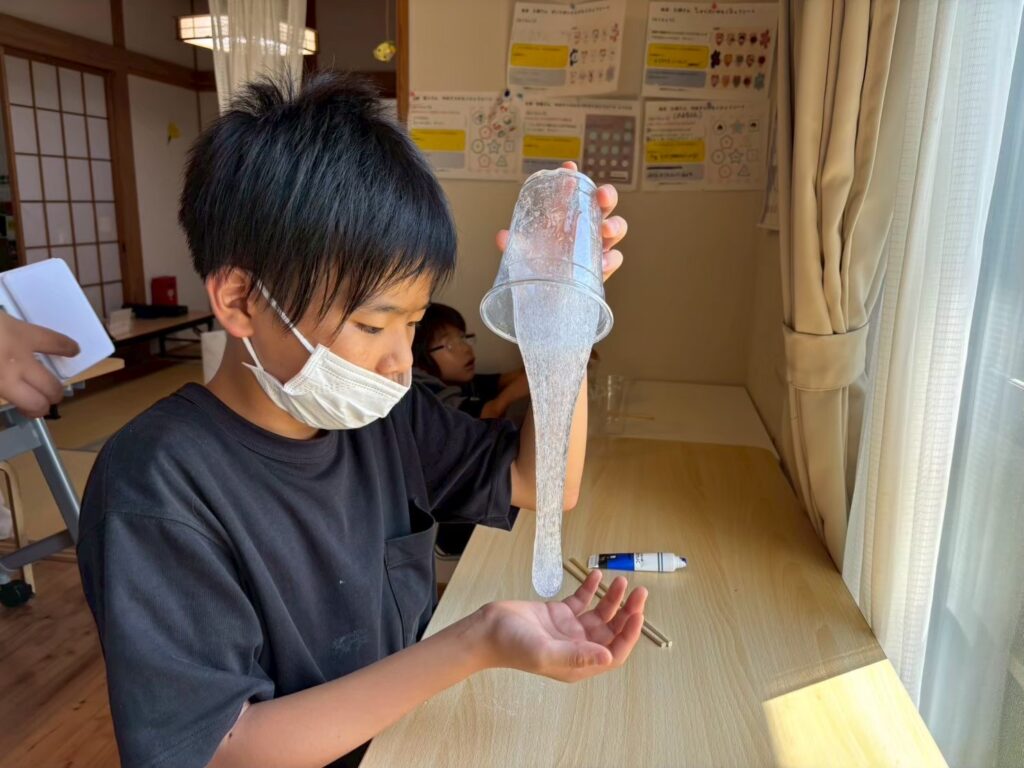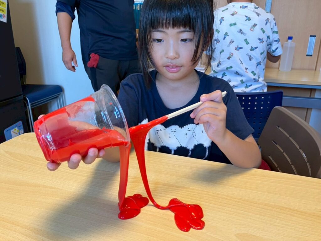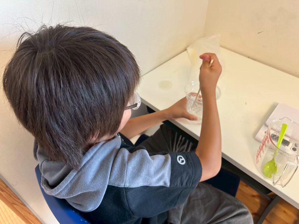 同じ分量なのに混ぜる速さとタイミングでそれぞれ違う感触のスライムができ、友だちと触り合いっこしながら、何回も実験を重ねられていました✨