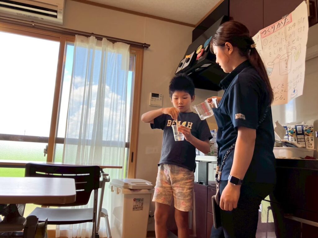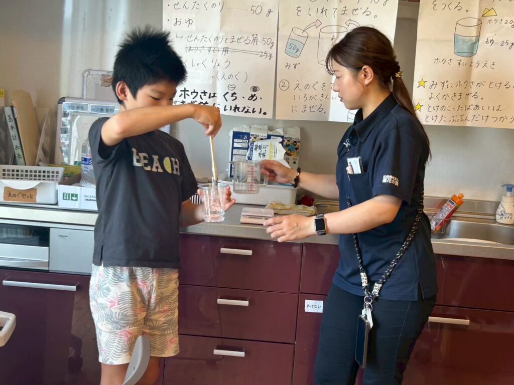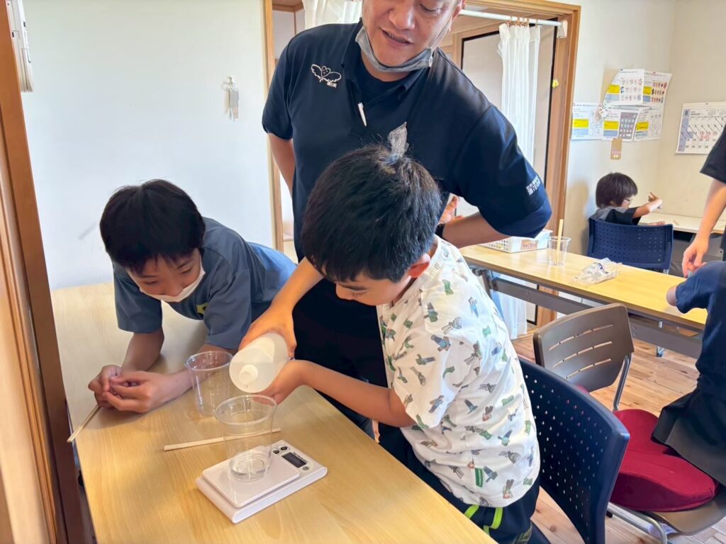 液体のり、水、ホウ砂を混ぜトロトロになる瞬間を楽しむ子どもたち。分量もしっかり計りみんなで協力して作りました✨